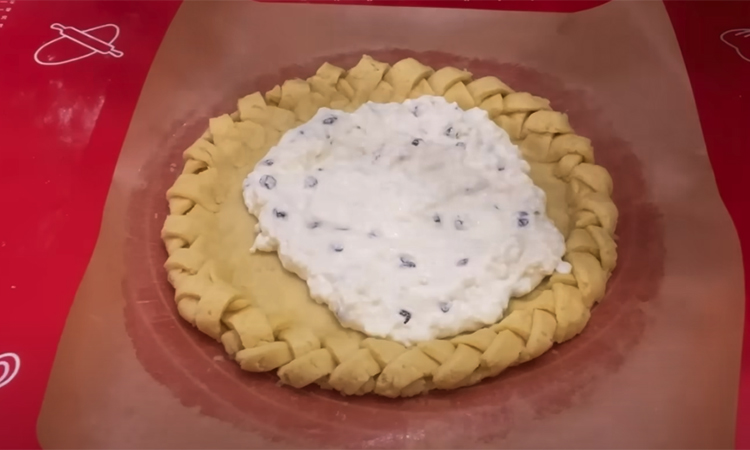 Заверните в пленку и уберите в холодильник. Тем временем подготовьте творожную начинку. Смешайте творог, манку, сметану и ванилин, взбейте смесь блендером до однородности. Отдельно взбейте белки с лимонной кислотой и сахаром до устойчивых пиков. Аккуратно соедините белки с творожной массой, добавив изюм. Достаньте тесто, разделите на две части.